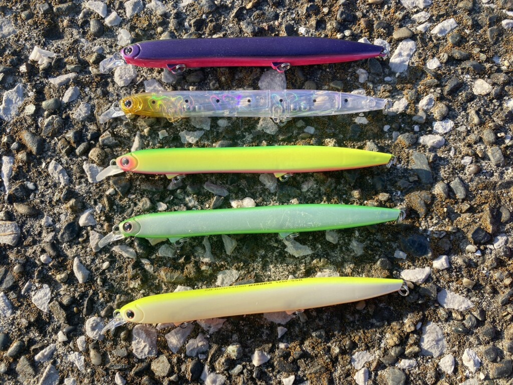 ただシーバスがスレていたり活性の低いときは目立ちすぎて逆効果になることもありますので、そんなときは「ブラック、グリーン、ブラウン、ゴーストクリア」などの地味なカラーが有効です。