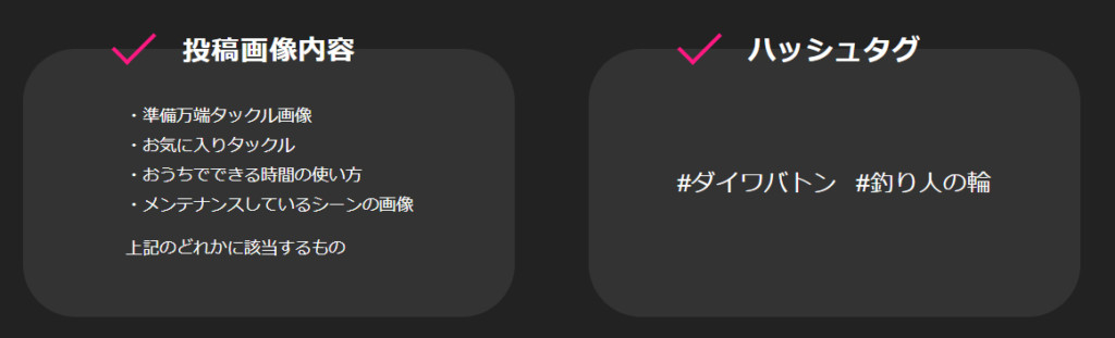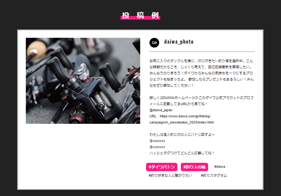 釣りに行きたいモチベーションを、ダイワバトンでつなげて、みんなでがんばろう!という主旨のインスタ投稿プレゼント企画。