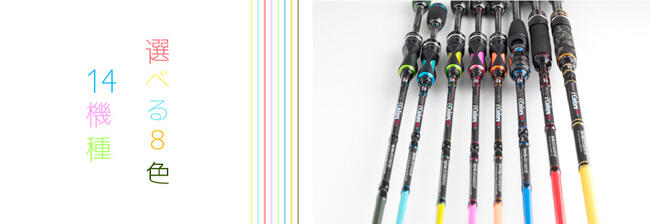 カラフルなロッドでパックロッド仕様。8色あって14機種とラインナップも豊富です。例えば子供には短い5フィート台のロッドでイエローのロッド。彼女や奥さんには6フィート台のピンクのロッドというように、好きな色、好きな長さを自分でコーディネイト出来ます。
