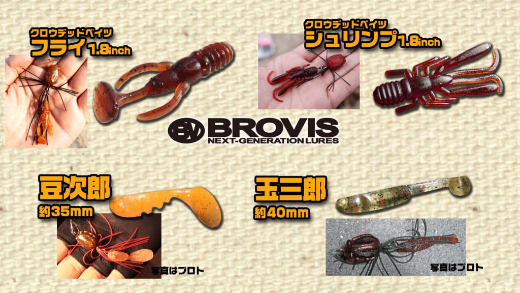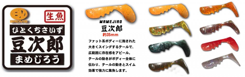 トレーラーワームは甲殻類などのエサを意識したチヌが多い場合は、クロウデッドベイツ・シュリンプ1.8inch、そしてハゼやシャコ、エビ類を意識している場合はクロウデッドベイツ・フライ1.8inch、あと小さいベイトフィッシュを意識している場合は豆二郎(まめじろう)もしくは玉三郎(たまさぶろう)を選択することが多いです。ちなみに豆次郎と玉三郎の使い分けはアピール大きくしたい時には大きいシャッドテールの豆次郎、控えめな波動で誘いたい場合は微波動をだす丸いテールのついた玉三郎をセレクトします。