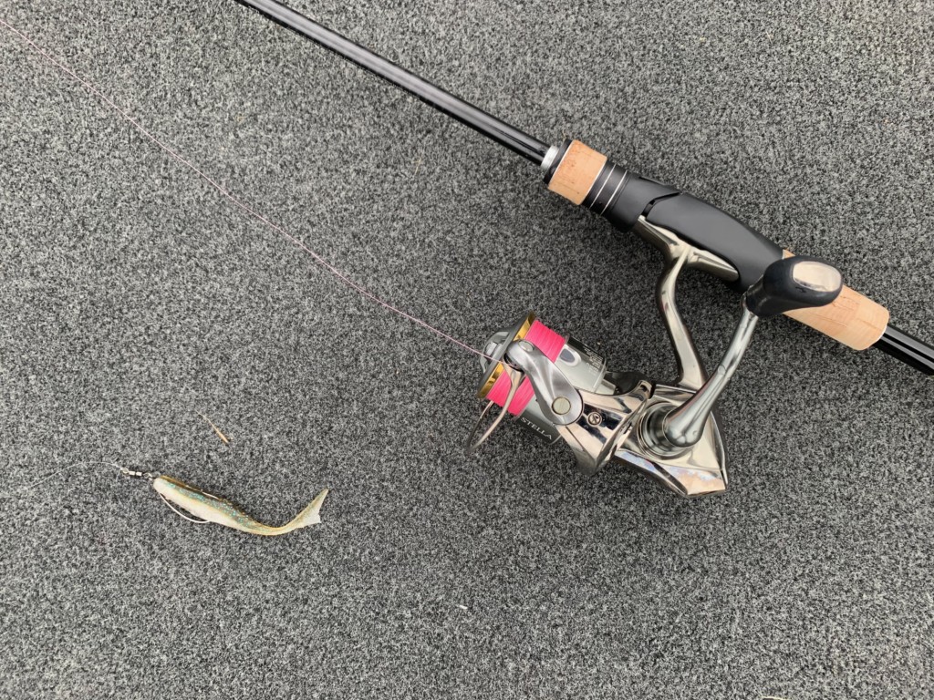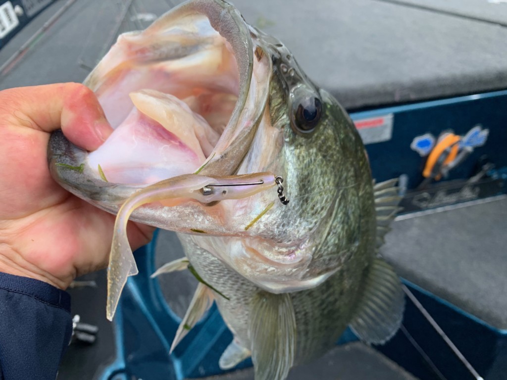 そうなると、マッチザベイトで3~4インチのワームを「ノーシンカー」や「ネイルシンカーを入れたネイルリグ」でロングキャストしてI字、またはウィードの際を狙うといった釣り方にバイトが多発する事となっております。