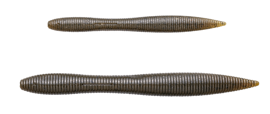 また、テキサスリグで使用した際は、ウネるボディ…扁平に膨らんだテール中央部のクビレがテキサスリグでのフォール時やボトムクロール時に水を強く掴み、強い波動を出すことが可能。