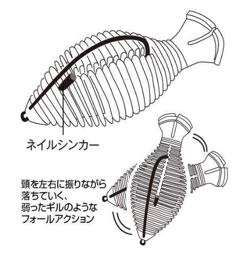 1/64~1/32ozのネイルシンカーを頭部に挿入(イラスト参照)したネイルリグにすると、まるで弱ったギルのように頭を左右に振りながら落ちていくフォールアクションが出せるんです。