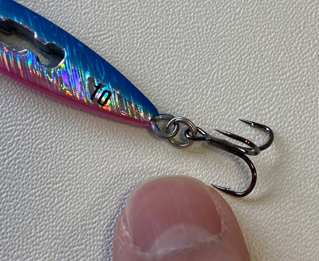 そしてリアフックは小型トレブルフックを装備。このトレブルフックですが、ジグの動きを活かすため、またアクションした際にエビらないように絶妙なサイズのフックをセレクトにしています。