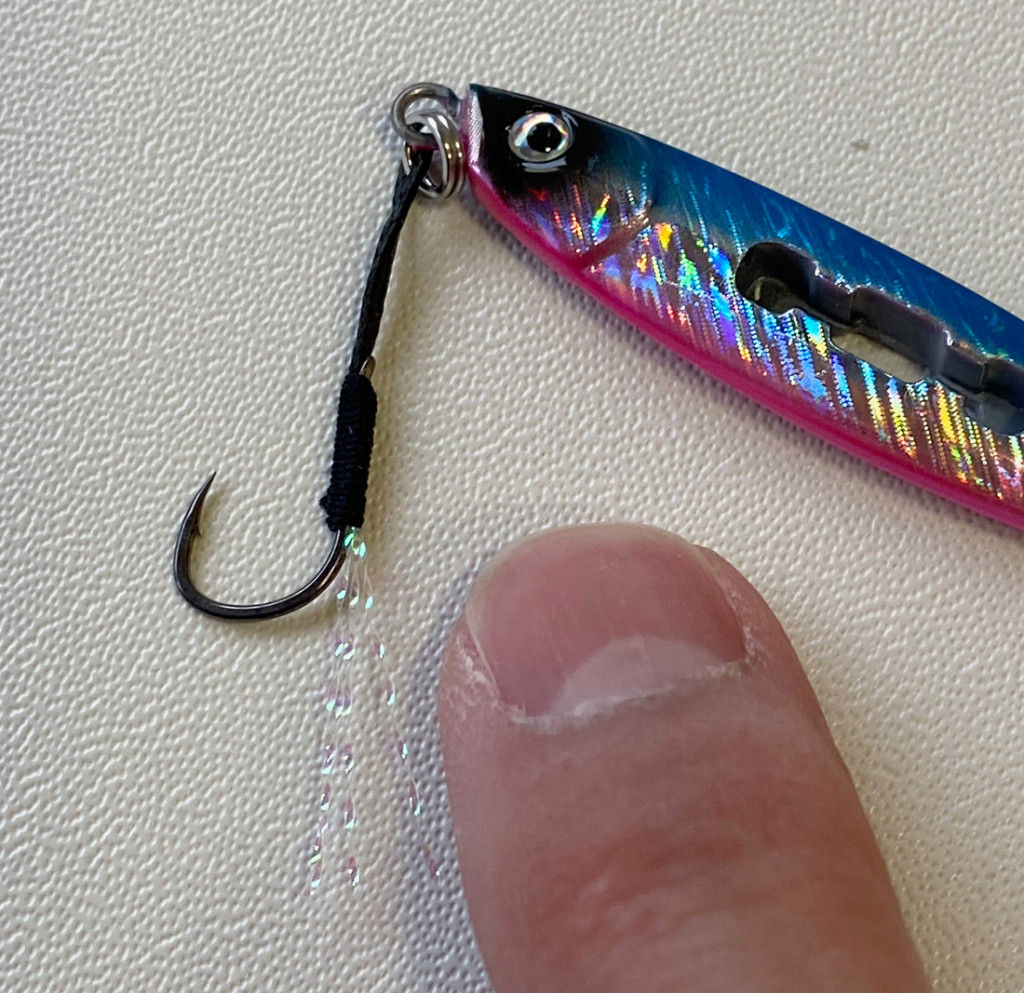 フロントフックには、ティンセルを巻いたシングルフックを装備。ティンセルの視覚的なアピールはもちろん、ジグの動きを抑えピンポイントでアクションが付けやすくなっています。