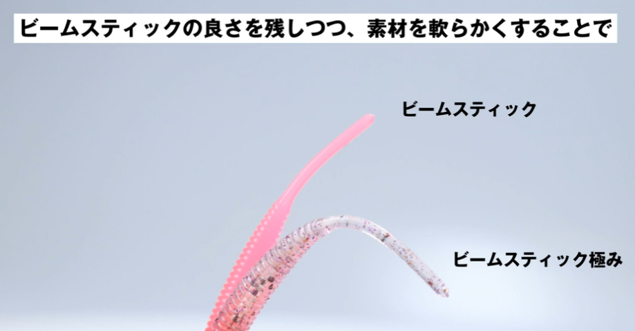 そして、面白いのが素材の軟らかさの変更。ビームスティックを使ったことがある人ならご存知かと思いますが、かなり弾力のある素材で、天敵フグにも結構耐久性があったり(笑)、ワームのズレが少なかったりする素材でした。