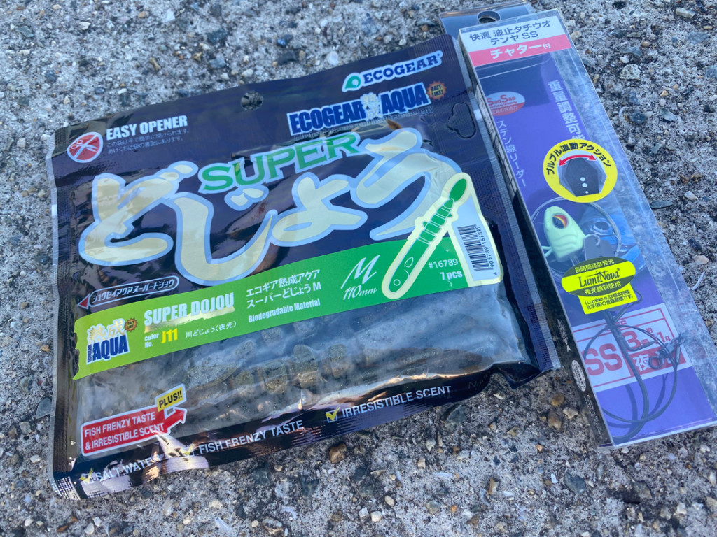 「エコギア熟成アクア スーパーどじょう M」を「快適波止タチウオテンヤSS チャター付(ダイワ)」にセットしたリグ、名付けて「どじょうチャター」です。