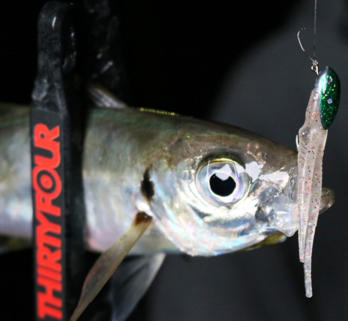 アジが多くて密度が濃い場合は、少々早くジグヘッドがプランクトンの中を通過したとしても、アジが見つけてくれる可能性が上がりますが、密度が薄いと見つけるまで時間が掛かるので、より長くワームをキープさせないといけません。