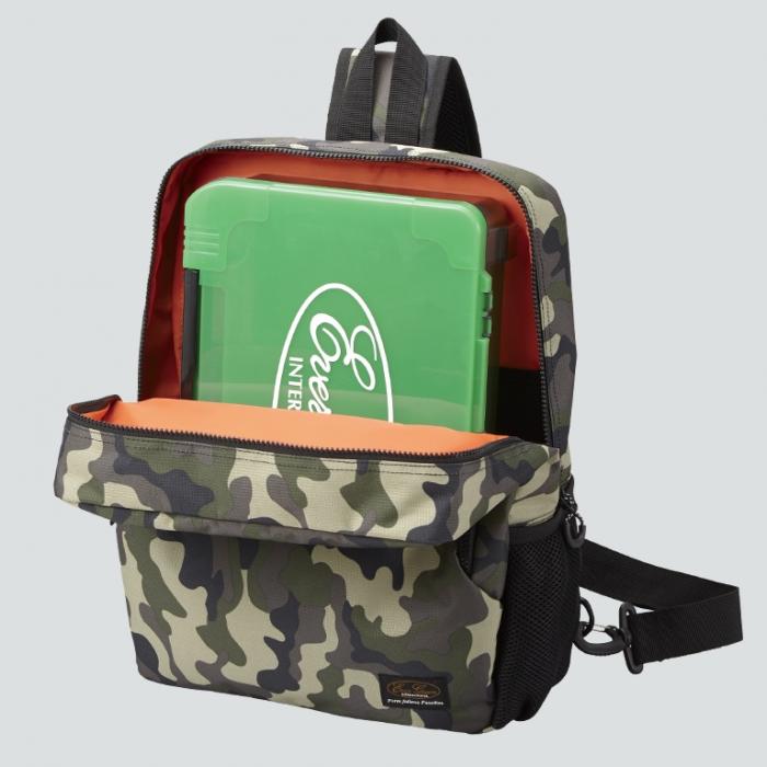 前述した通り大容量なのですが、具体例を一つ挙げると、メインポケットにはエバーグリーンのインナーボックスビッグフリーグリーンを入れても、さらに小型インナーボックスやウエアが入るほどです。