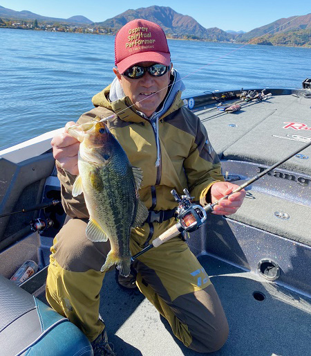 フォール中にバイトがあり、次のリフトで重みを感じたのでしっかりと巻き合わせでフッキング! ワカサギをたっぷりと食べたコンディションバッチリのバスだけに引きも最高! バレることが少ないルアーなので、ジックリとネイティブバスのファイトを楽しみます。