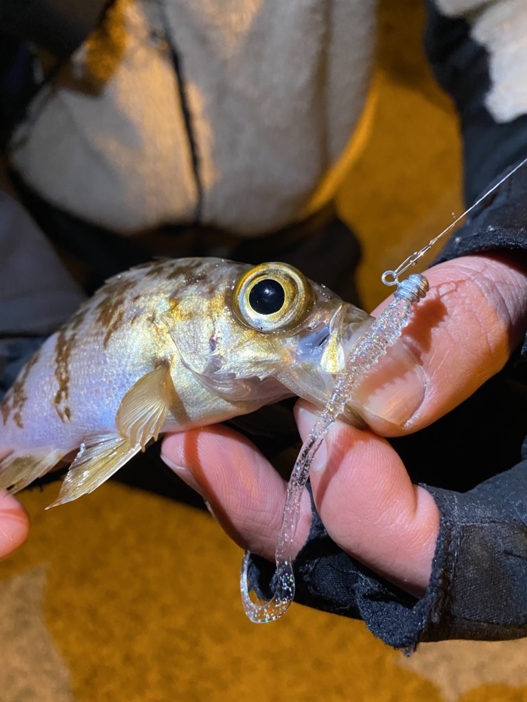 この時には2.8inのタイドカーリーと同じくらいの大きさの小メバルも釣れましたが、2.8inがすっぽりと口に吸い込まれており、吸い込みの良さを実感しました。