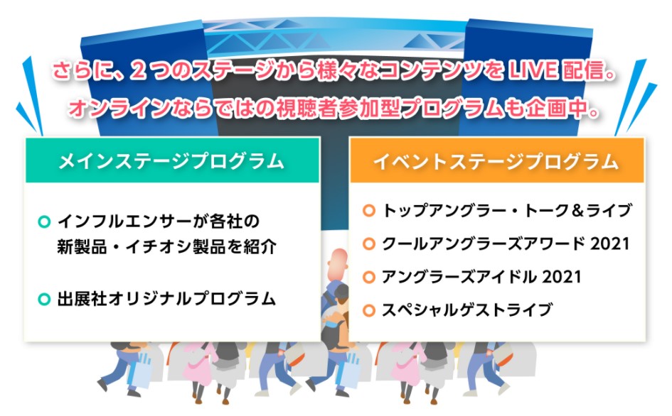2つ目はオンライン上の2つのステージ、「メインステージ」と「イベントステージ」から色々楽しめるコンテンツをLIVE配信!