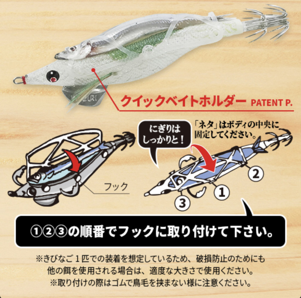 そういったアングラーの声を聞き、当社独自の「クイックベイトホルダー」を開発したのが、このエサ巻エギ「スシQ」です!