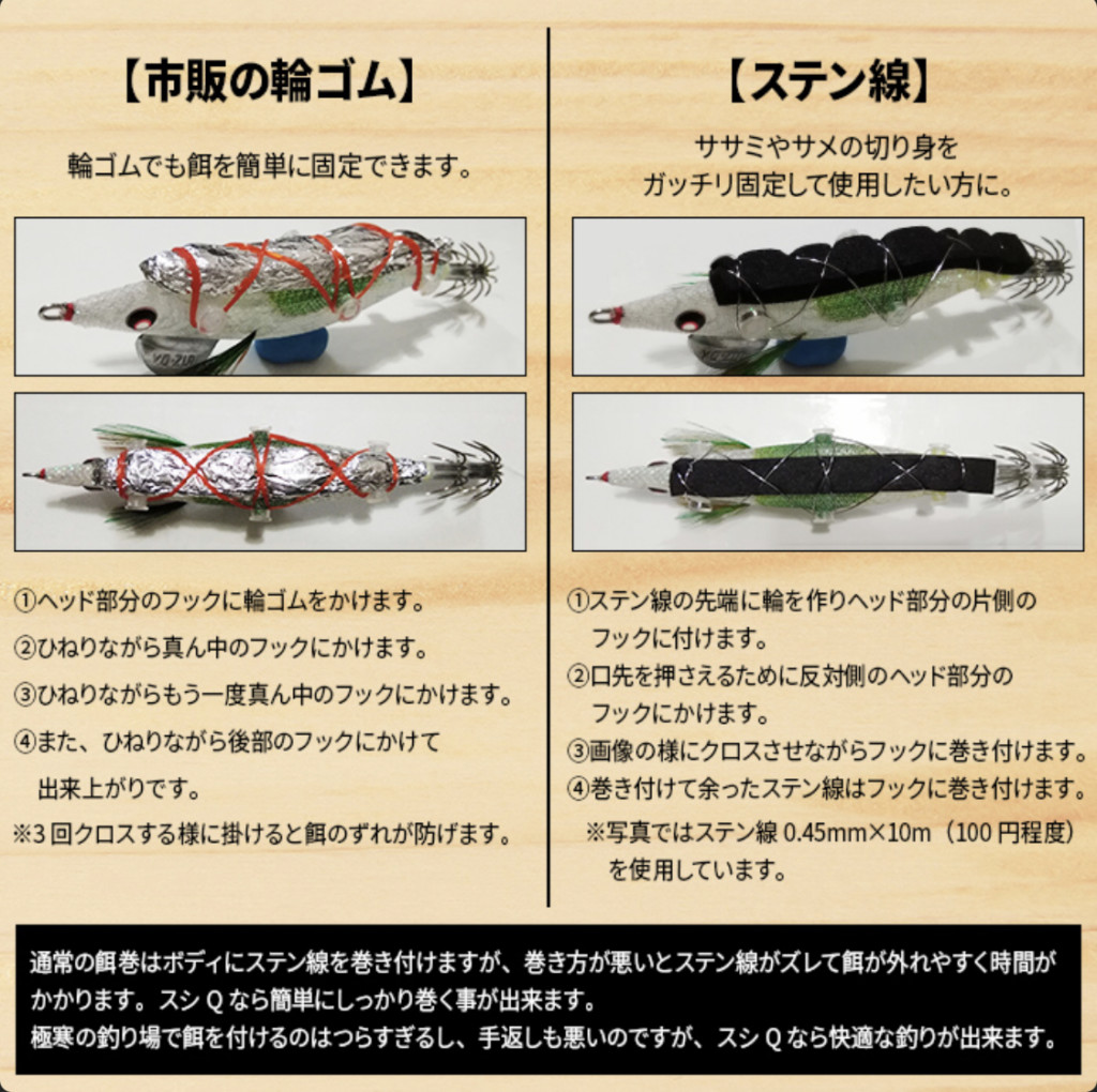 こちらも通常のエサ巻エギに比べ、ステン線が巻きやすく、エサがズレる心配もありません。