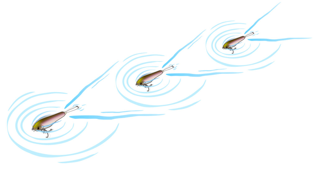 シェイキングを断続的に加えると、あたかもベイトフィッシュが水紋を作り逃げ惑う様を再現。またピンポイントで水紋を起こしても、突如フィッシュイーターに追いかけられるベイトフィッシュを演出し、バスの捕食スイッチが入るそうな。