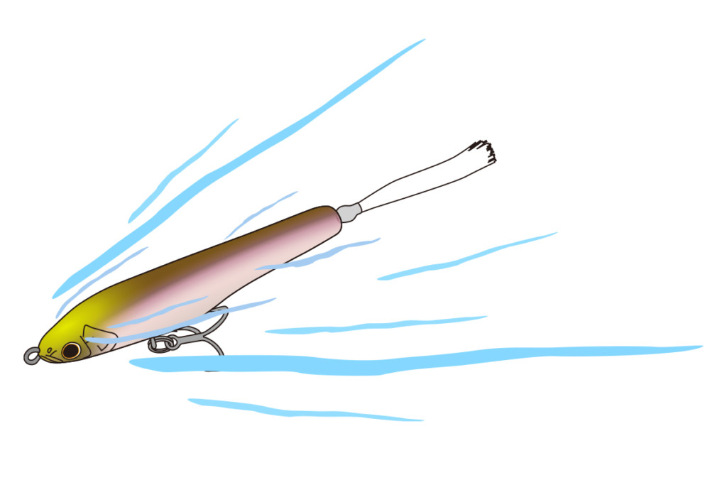 シンキングタイプは主に、水面下をi字アクションでトレースさせる使い方。水温や風などで、表層には出にくい状況下で活躍。