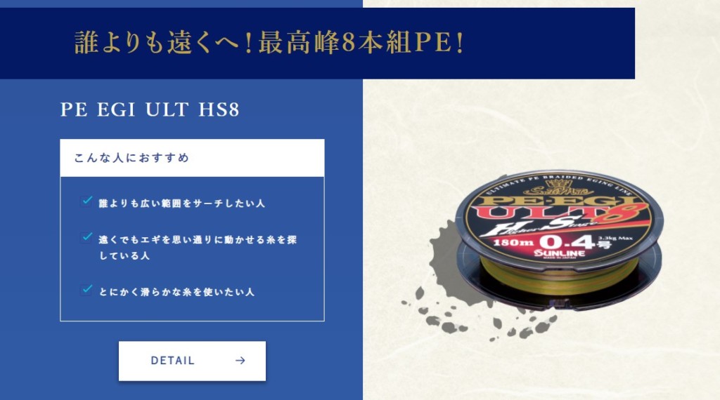 どのラインを使うか迷う…そこで、サンラインのエギ用ライン(リーダー含む)全8種を紹介してくれるこんなサイトが。