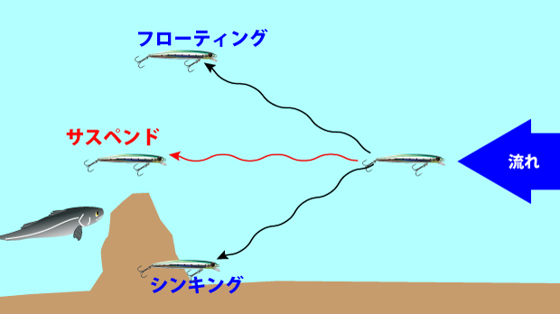 SSP(セミサスペンド)の場合、海水では超スローシンキングであり、テンションが掛かっていない時でも大きくレンジが変わらないので魚に違和感を与えにくいメリットがあります。