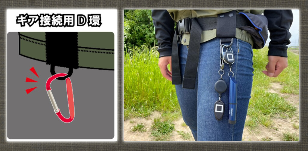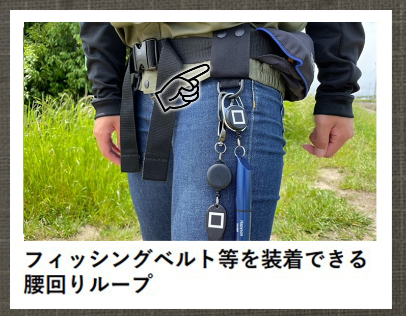良く使う小物類を色々ぶら下げておくことができて便利! さらに腰回りにもループを採用。ライフベストなどのベルトをコレに通すことによってズレ落ちることを防ぎます。