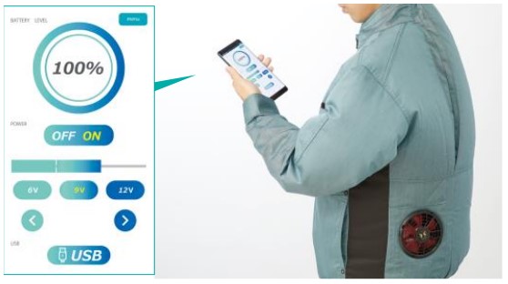 スマートフォンで専用アプリを取得してウエアとアプリを連動させることで、電源ON/OFFの切り替えや風量の調節などがスマートフォン1つで行うことができます。コレは流石に記者自身も驚きました。ウエア本体に触れず、スマートフォンだけでコントロールできるって便利ですよね。