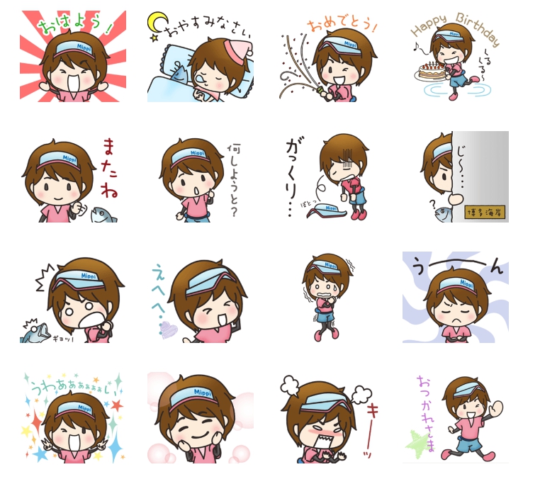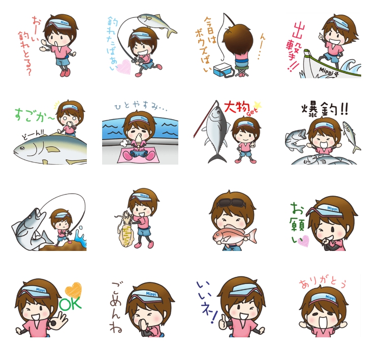 釣りガール”みっぴ”の公式スタンプです。博多弁混じりの言葉で、釣りのアレコレを表現しました★みっぴと一緒に、色んなシーンでトークを楽しんじゃおう!