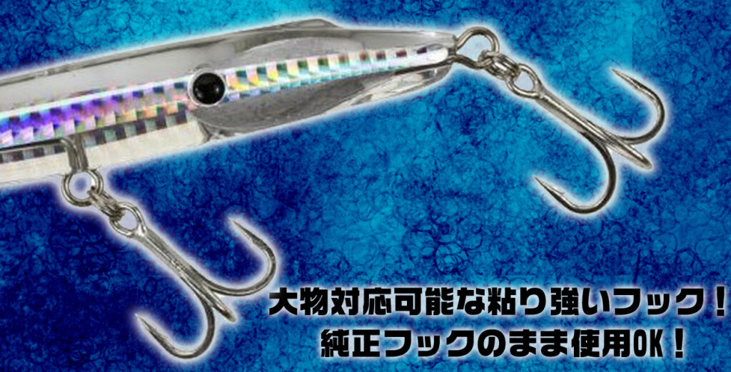 ブリクラスでも対応可能な粘り強いフックが標準装備されているのも魅力。もっと大きな魚種にも対応できるように、1サイズUPしたフックも装着可能になっています。
