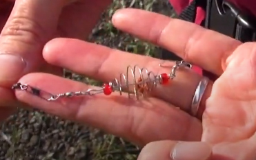 下部のオモリをこんなラセンおもりに交換して練り餌を付けると、集魚効果が大幅アップ。さらに魚が集まってきて効果的なんだとか。