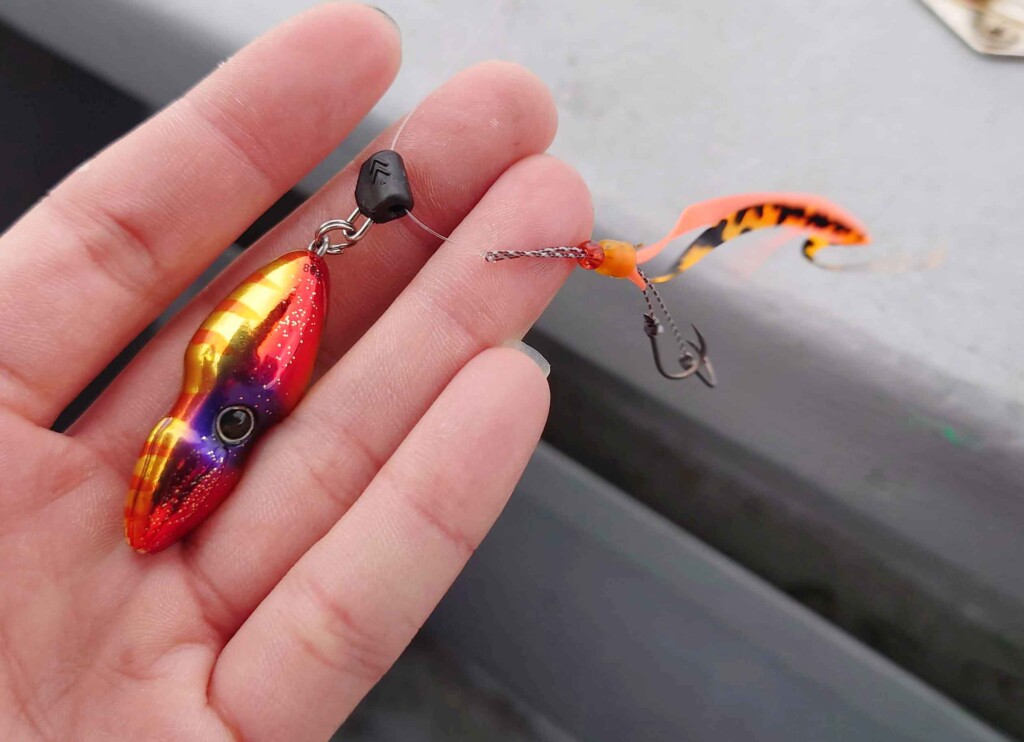 タイラバの場合、ヘッドが上側でネクタイとフックは下側にセッティングされていますが、「TGビンビンスイッチ」はヘッドとネクタイ、フックが1箇所に集中しています。