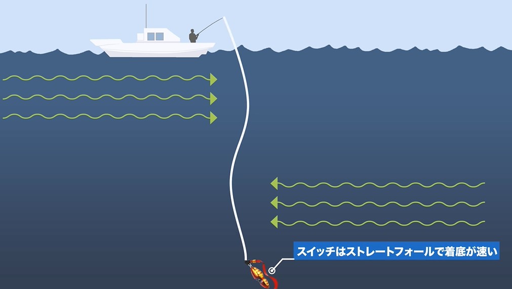 流れによって左右に流されながら着底。糸ヨレが起こりやすい。