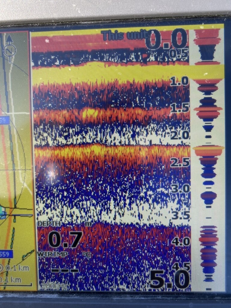 どんなに最先端の高性能な魚探を使っても、こういうエリアを読み取ることは不可能なんです。実際、魚探を掛けるとこちらの写真のように…。水深が浅い上にウィードが生えているので、バグって写ってしまうんです。
