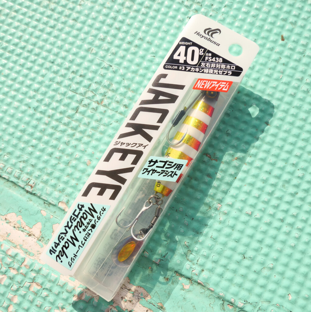 朝イチは「ジャックアイ マキマキ サゴシスペシャル」(40g)(アカキン緑夜光ゼブラ)を使います。