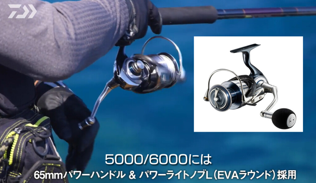 ハンドルノブはSサイズに対応。ショアジギング、ライト寄りのオフショアジギング、ライト寄りのオフショアのジギング&キャスティングが主体となる5000・6000サイズには、EVAラウンドタイプのパワーライトノブLを採用。