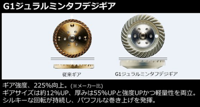 強度と軽量性を両立するG1ジュラルミン製MCタフデジギア。ギアサイズは、従来機種と比較し、最大でギアの外径を約12%アップ、厚みを55%アップ。