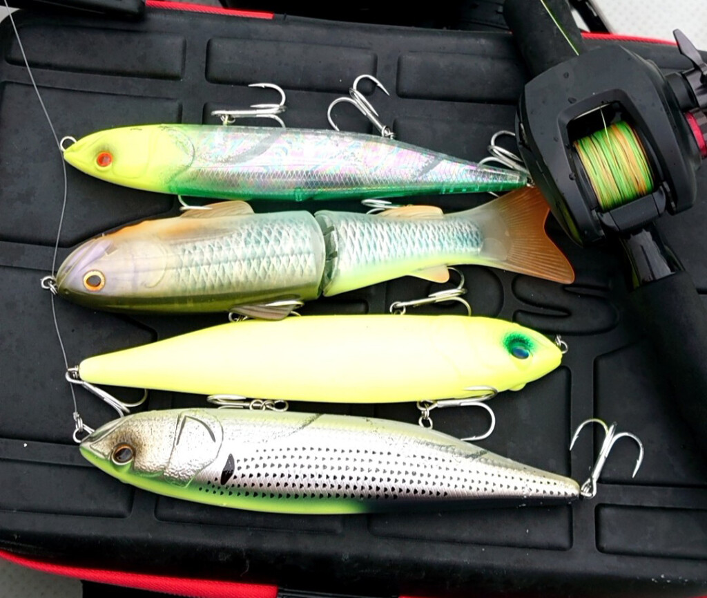 そしてルアーは、東京湾コノシロパターンで大活躍中の「ヒュージペンシル ウォーカー」と「ヒュージペンシル スケーター」の各音アリ音ナシの4種類を用意! フォロー用に「newスライドスイマー250」(ファーストシンキングチューン)や「グルカナイフ」、「ヒュージスピナーベイト」、「サーキットバイブ」(1oz)も忍ばせました。