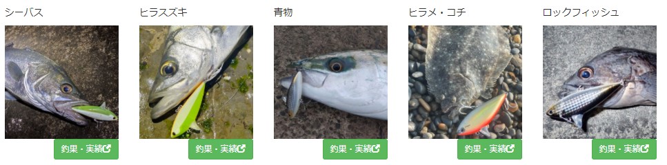 ローリングベイトシャッドで想定されるターゲットが紹介されていて、それぞれリンクを開くと直近の釣果情報が出てくるという仕様。