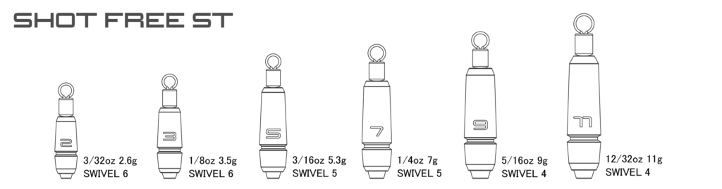 ショットフリーRも同様、スイベルの糸通りを良くしてあるので、フリーリグはもちろん、様々なリグに活躍するシンカーです。