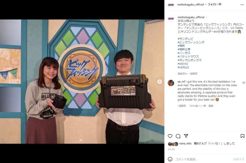 明邦化学工業は1947年(昭和22年)創業、大阪市に本社を置くプラスチックボックスやケースなど、色んな収納アイテムの企画製造販売を行っているメーカー。取り扱っているアイテムは、タックルボックス・工具箱、カー用品・救急箱・ピルケース、クラフトケース・各種スプレー・各種ケミカル商品など。 主に「FishingMEIHO」「FishingVERSUS」「GeneralMEIHO」の3ブランドを展開。「FishingMEIHO」「FishingVERSUS」の2つは釣り専門ブランドでバケットマウスシリーズやランガンシステムボックスシリーズなどが人気!