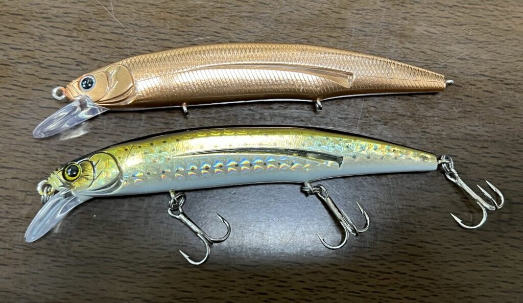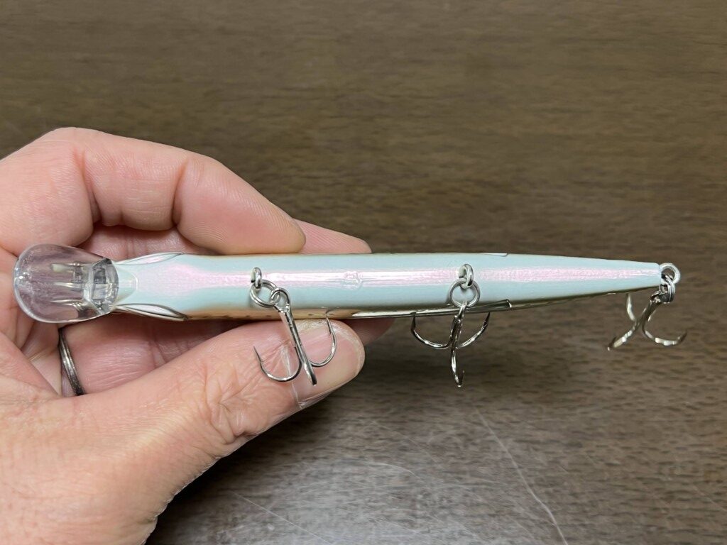 ウエイトは固定式、約33gでブッ飛び仕様。ボディはこれまでのHUミノーがベースになってはいるんですが、アイやリップなどの位置を見直し、サイドの溝も深くしてベストなバランスに再設定。