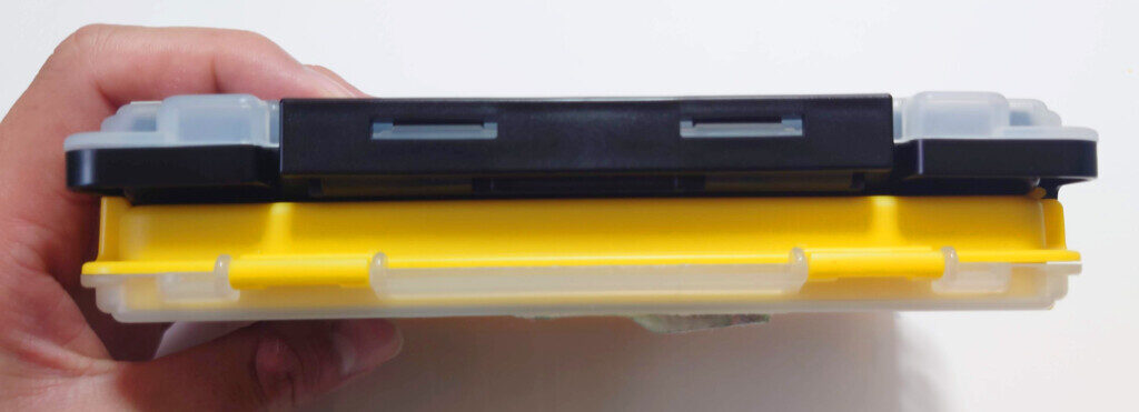 では、普段「ライトゲームケースJ」をどのように持ち運んでいるのかについてですが、フィールドを開拓する時や短時間釣行の場合は、ジグヘッドを収納した「スリットフォームケースJ」と連結させてズボンのポケットに入れるということを良くします。