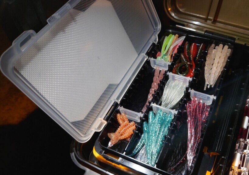 スタメン候補のワームをこのように収納できることで、とにかくワームのローテーションがスピーディーになります。フタにはワームスリップ加工が採用され、フタにワームがくっついて飛び出すということもありません。