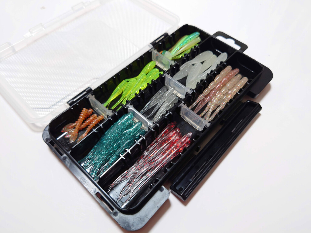 付属している15枚の可変仕切板を活用することで、種類やサイズが異なるワームをまとめて収納することができます。因みに記者が普段使っているケースはこんな感じ!