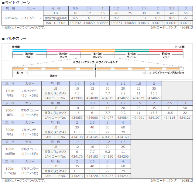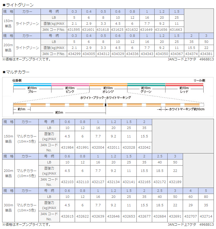 マテリアルには、表の上から2番目「EX-PE」を採用。品質を落とさずにコストを抑えた製法加工により、高強力&ローコストを実現したマテリアルで、滑らかながら適度なハリとコシを持ち合わせたPEラインとなっています。