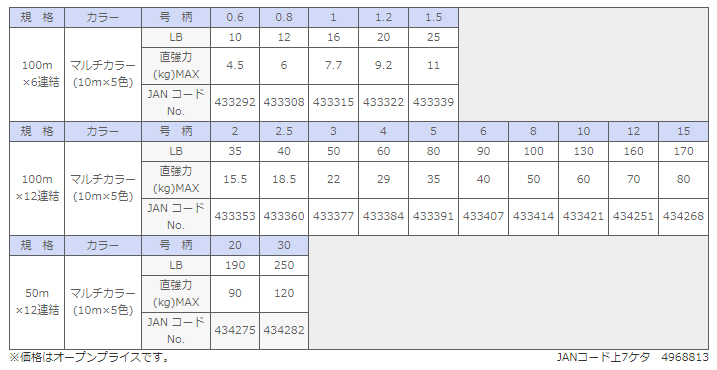 まず4本撚りと8本撚りの2種類がラインナップされていて、それぞれライトグリーンとマルチカラーの2種類のカラーパターンが用意されています。