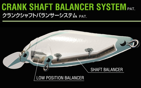 世界で初めて、VISION95で採用されたアイティオーのシャフトバランサー機構。FLAPSLAPでは、ロール軸上に設定された低重心シャフトバランサーの後尾端のみを、ロール軸上から偏重してセットアップ。偏重クランクしたシャフトの横転運動が生み出す強烈なワッキーアクションは、スリムなシャッドボディでは生み出せなかったダイナミズムを発揮。従来のスリムミノーでは生み出せなかった、トゥイッチやジャークで生まれるアクロバティックアクションは“フラップスラップ(バタバタ)”たるゆえん。なお、VISION95で多くのスレバスのスイッチを入れた、リトリーブ停止後に見せるブルっと身を震わせる”揺れ戻し”動作は、FLAPSLAPにも受け継がれています。