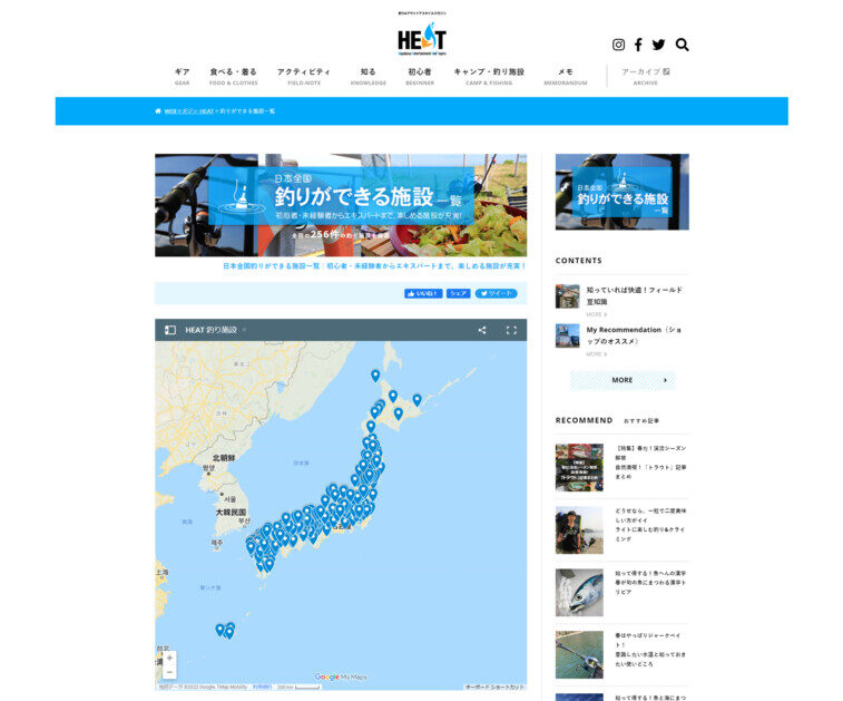 WEBマガジン「HEAT(ヒート)」内に設けられているコンテンツの1つ「釣りができる施設一覧」。皆さんご覧になられたことはありますか? こちらのページでは、釣り公園や釣りができるキャンプ場、釣り堀に宿泊施設、複合施設、テーマパークといった初心者・未経験者からエキスパートまで、釣りが楽しめる施設の情報が満載のページとなっています。
