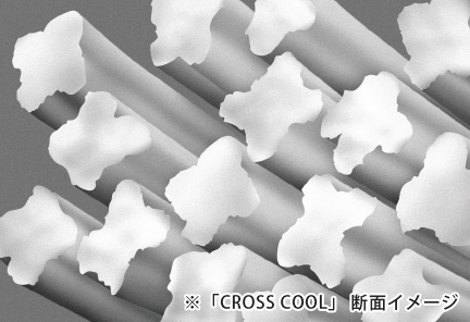 「CROSS COOL」の採用で、ひんやり涼しい着心地を実現! 以下の写真のようにX状の断面をした特殊ポリエステル繊維が採用されていることで、接触面積が大きくて着用時に肌からの熱移動が多く、涼しい着心地を実現しています。毛細管減少によって、非常に高い吸汗・速乾効果も実現。