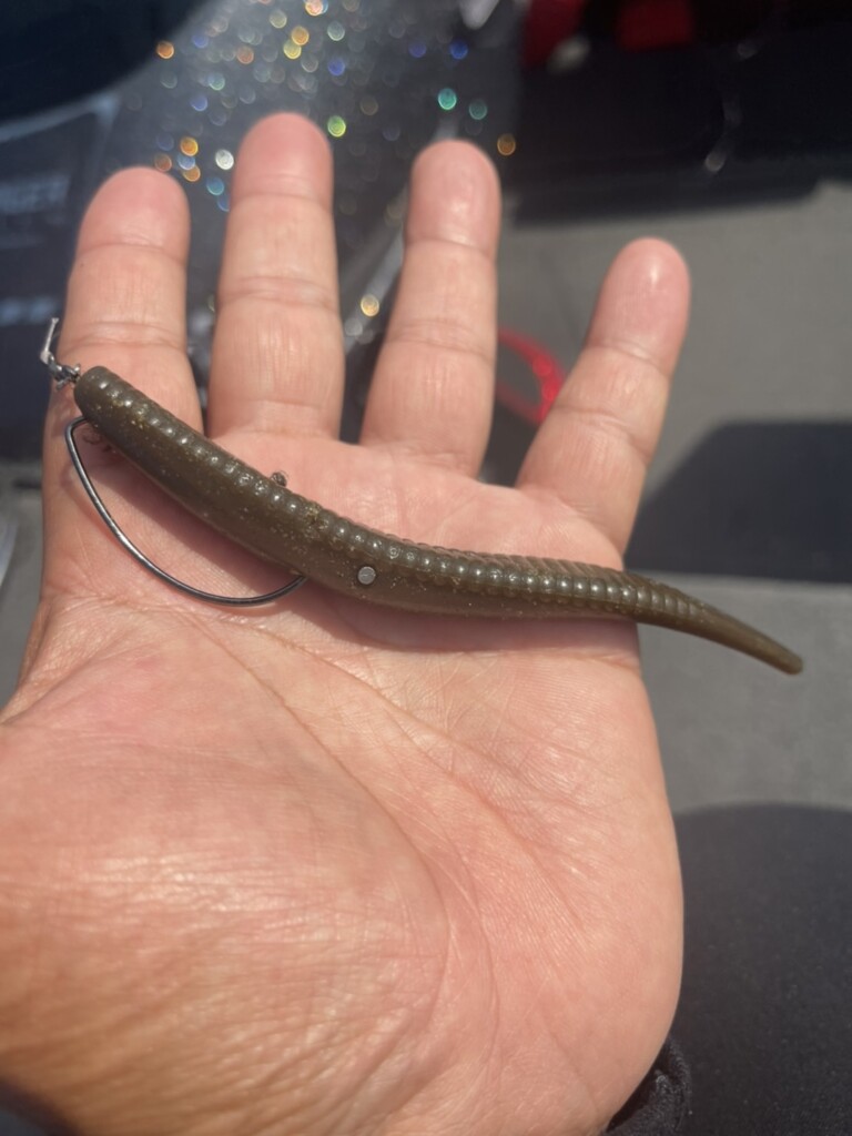 通常通りにセットし、針先はスリッドに隠しているだけでワーム自体には埋め込みません。掛け重視のセッティングです!