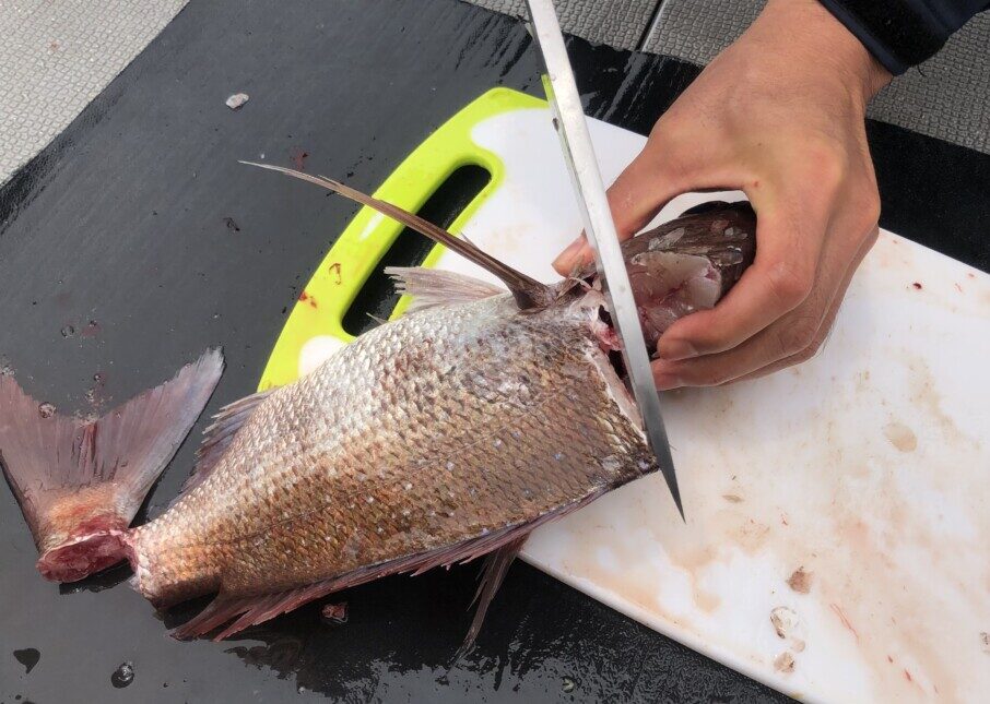 神経抜き・血抜きする魚の首と尾をナイフなどで切断します。
