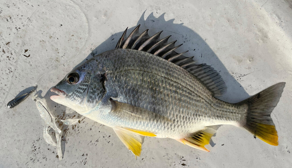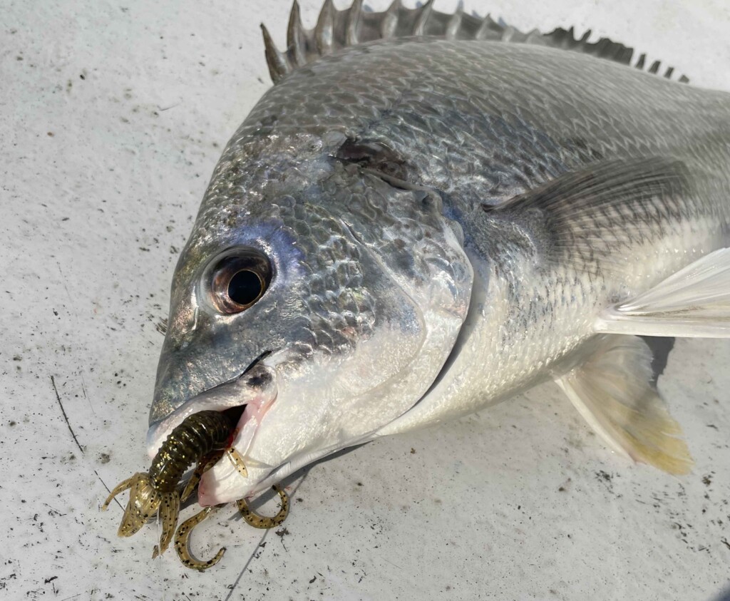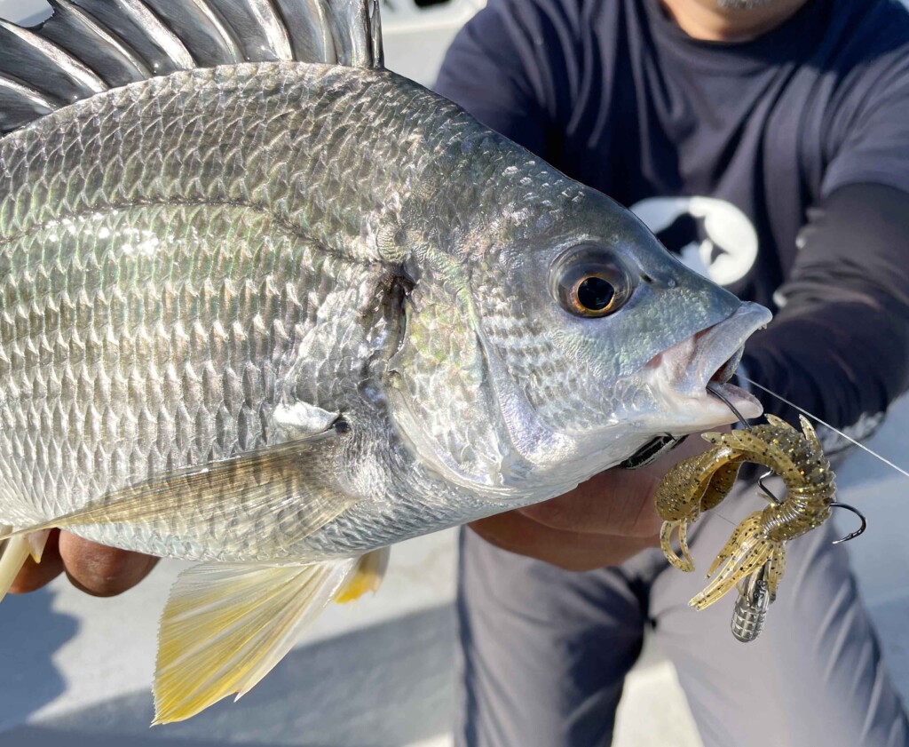 元々はバス用のホッグ系ワームですが、私はカサゴなどを釣るのに良く使っていました。尺クラスのカサゴをテキサスリグで何匹も釣ったことがあり、動きが良いのか存在感があるからなのか? とにかく良く釣れるワームです。私がチニングを本格的に始めたのは3年ほど前。クロダイの落とし込み釣りはガイドでも15年以上の経験がありますが、その中で年々キビレの釣れる枚数が多くなってきました。明らかに魚が増えている実感があります。