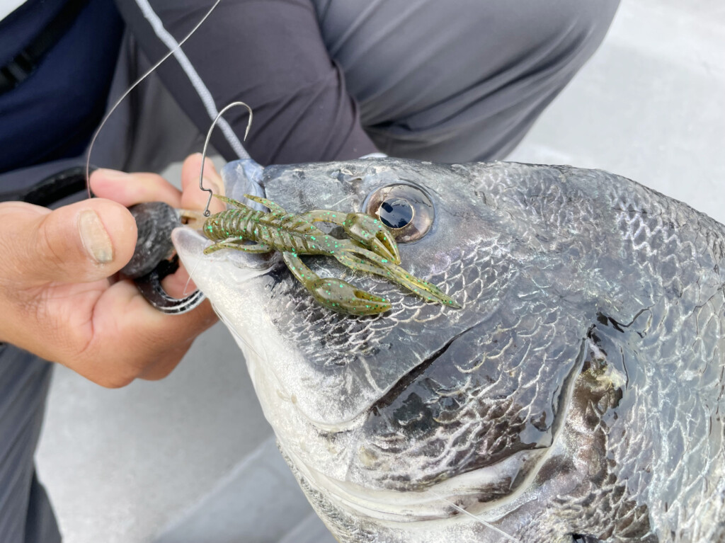 そのまま流しながら岩礁が少なくなってくると共にショートバイトが多発するように。乗らないアタリも増えてきました。そこでフックを小さくして、ワームを「ドライブクローSW」(2in)の「活ガニ」に変更。